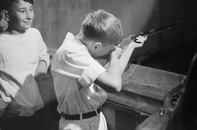 The Cigarette Shooting Gallery is a game where the customers used an air rifle to knock a standing pack of cigarettes off a stand. When the package of cigarettes is placed in the center of the stand, it will fall off when hit. However, if the package is placed near the front of the small stand, it will fall over but not off the stand.